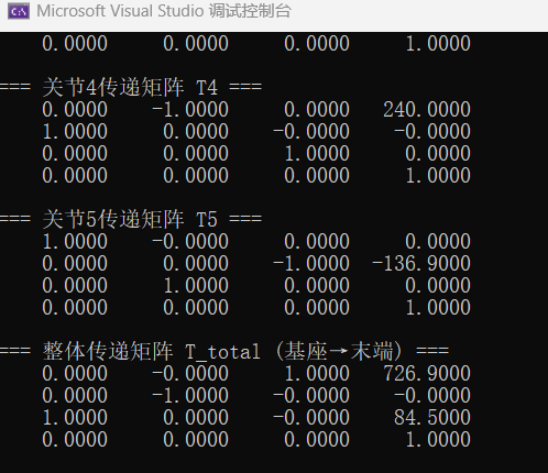 齐次变换矩阵为一 4×4 矩阵,主要由一 3×3 的旋转矩阵和一个位置矢量组成,由旋转矩阵可以得到欧拉角,位置矢量即为末端(吸盘)原点在底座(世界)坐标系下的坐标。由输出得吸盘在笛卡尔坐标系下的位置(726.9,0,64.5),与 matlab 一致。